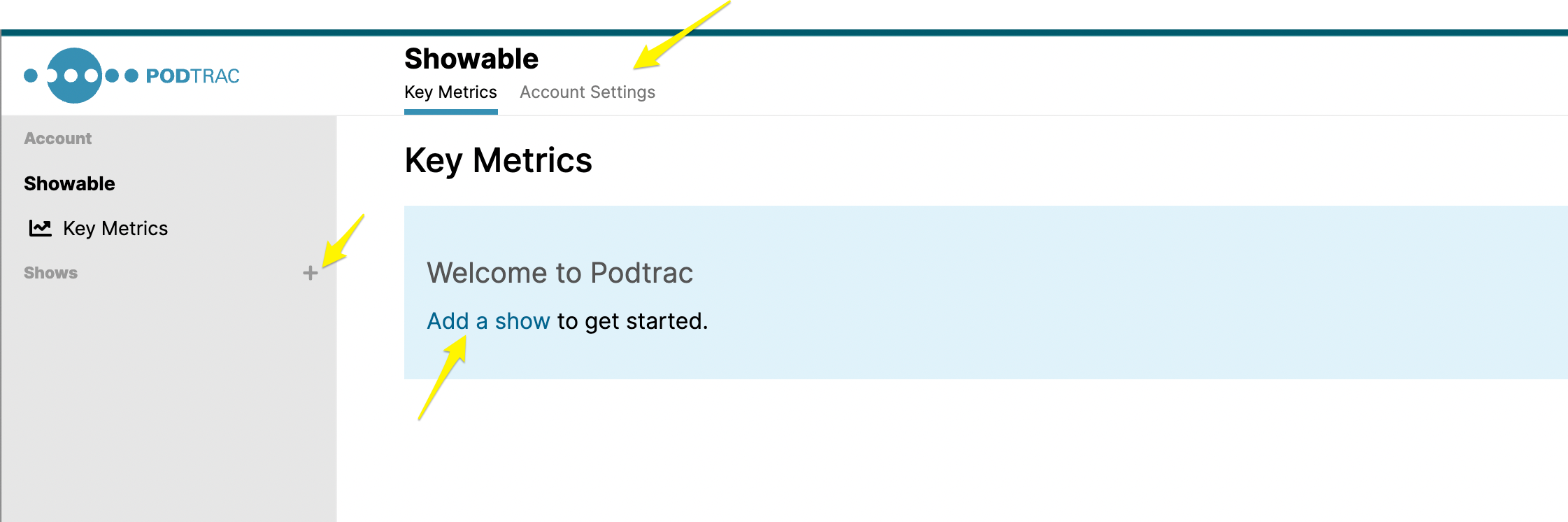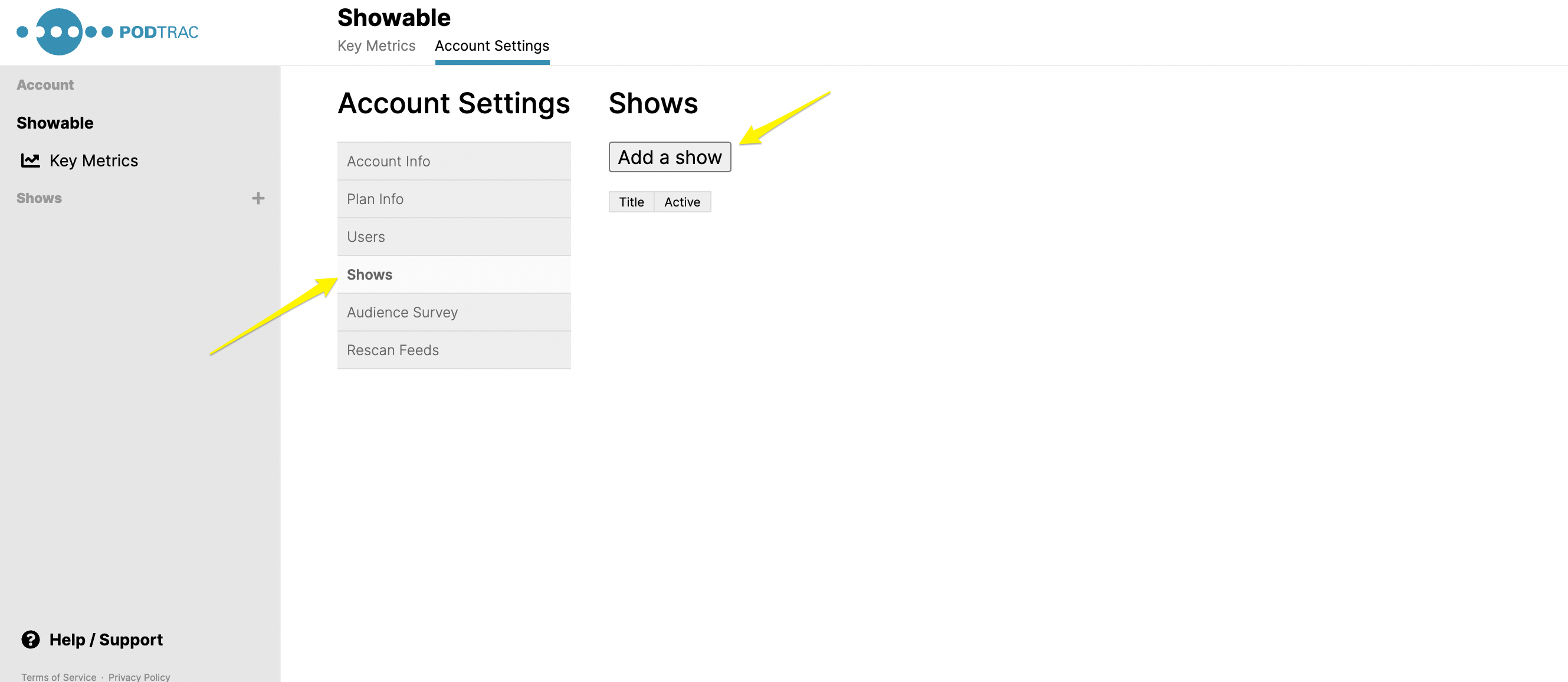 Once you have added your first show, you can add additional shows by clicking the "+" sign next to Shows in the left-hand navigation, or by clicking Account Settings, then Shows, then Add a Show.