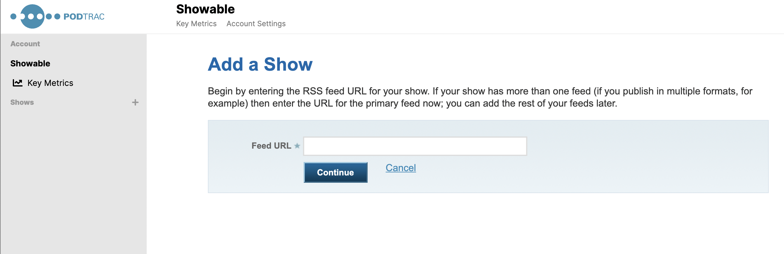 Click on "Add a show" to access the Add a Show screen where you can enter your show's RSS feed url.